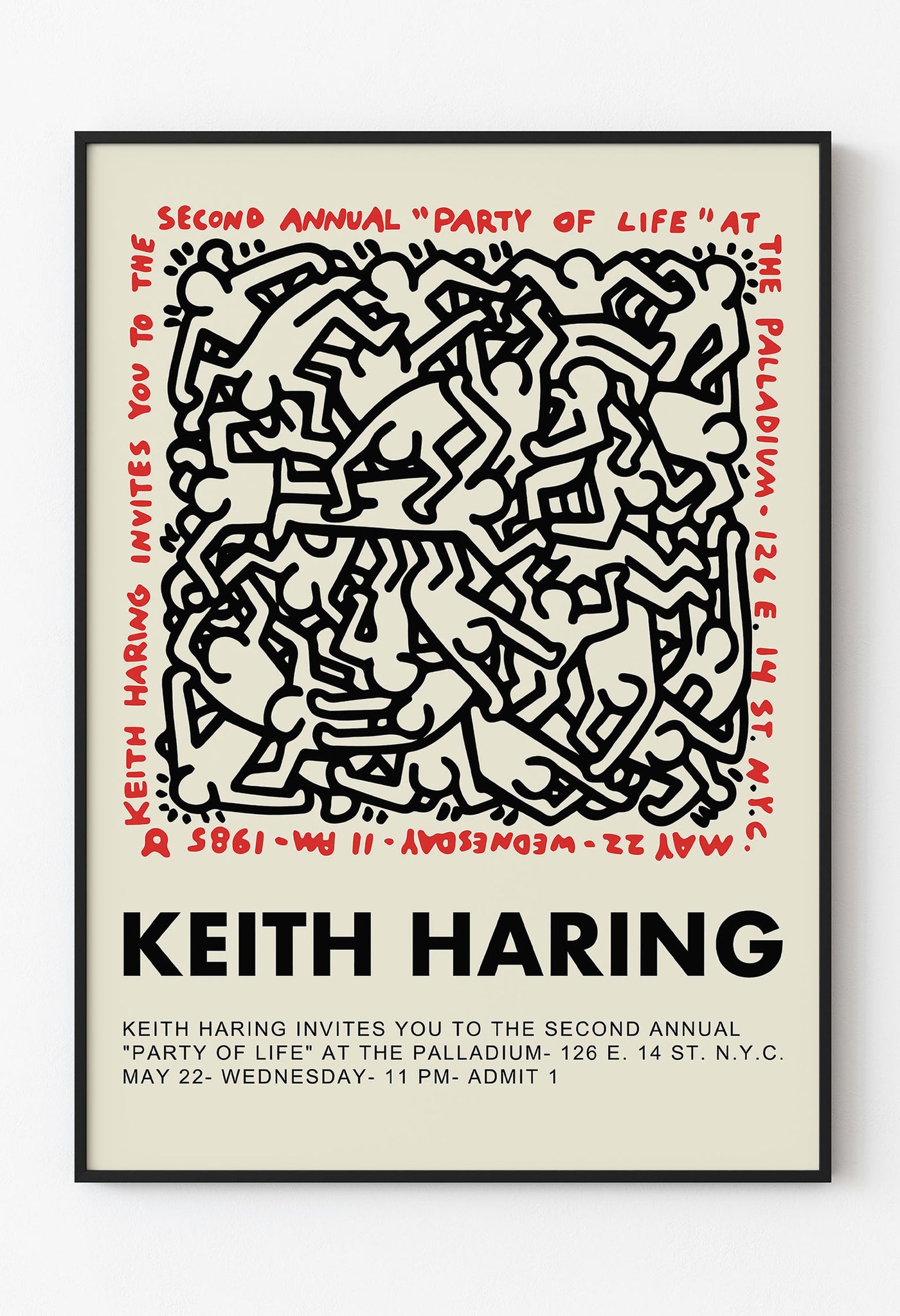 Bu çarpıcı poster, Keith Haring'in 22 Mayıs 1985 tarihinde New York'taki ünlü The Palladium kulübünde düzenlediği ikinci geleneksel "Party of Life" etkinliği için özel olarak tasarlanmıştır. Haring’in imzası haline gelen dinamik, iç içe geçmiş figürler ve canlı kırmızı-siyah detaylarla bezeli bu eser, 80’lerin New York sokak sanatı ruhunu yansıtan eşsiz bir koleksiyon parçasıdır.